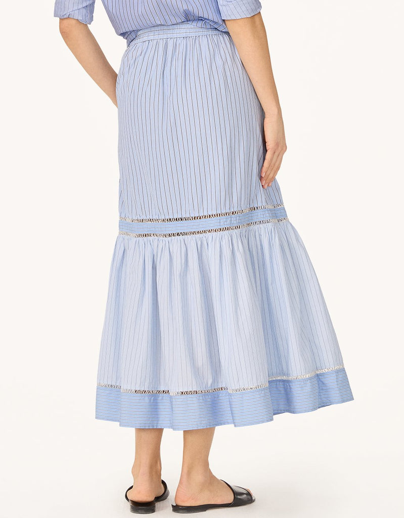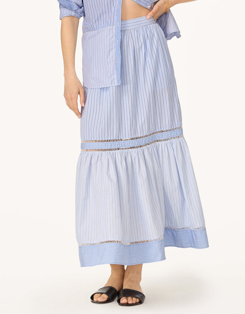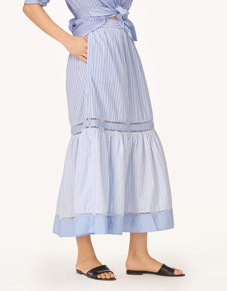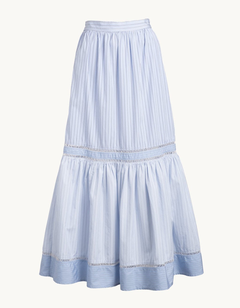 the epitome of ease, our patchwork poplin skirt is designed in a timeless, a-line silhouette with a single shirred tier.