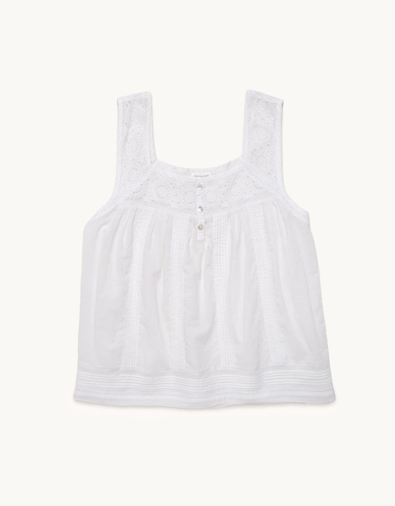 timeless elegance with an easy fit. this cotton voile tank is finished with pintuck and shirred detailing. the quarter placket features italian akoya-shell buttons.