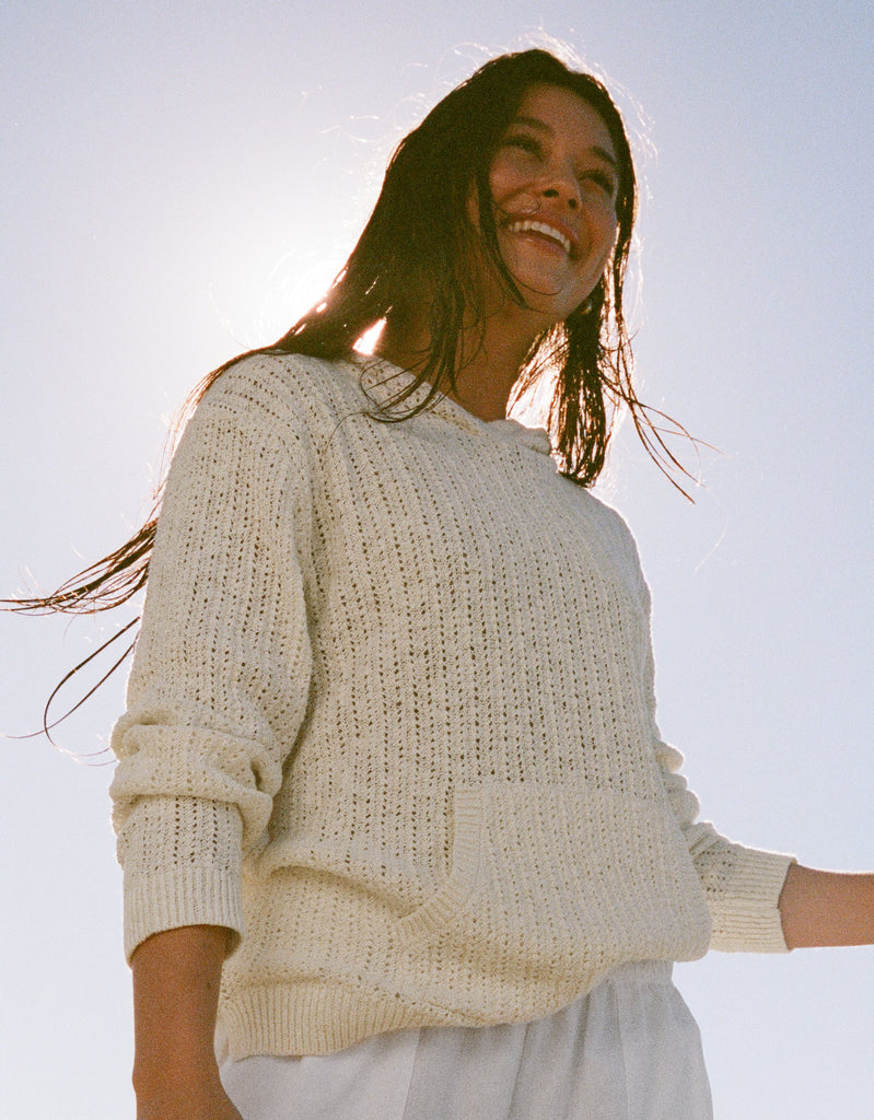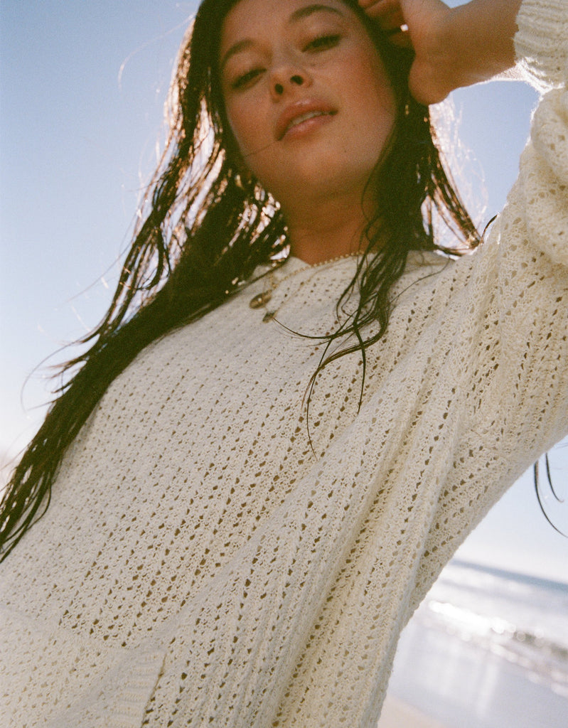 a layering staple made for chilly mornings or endless nights. it's made from a blend of linen and cotton with a distinctive, pointelle knit design and ribbed trims.