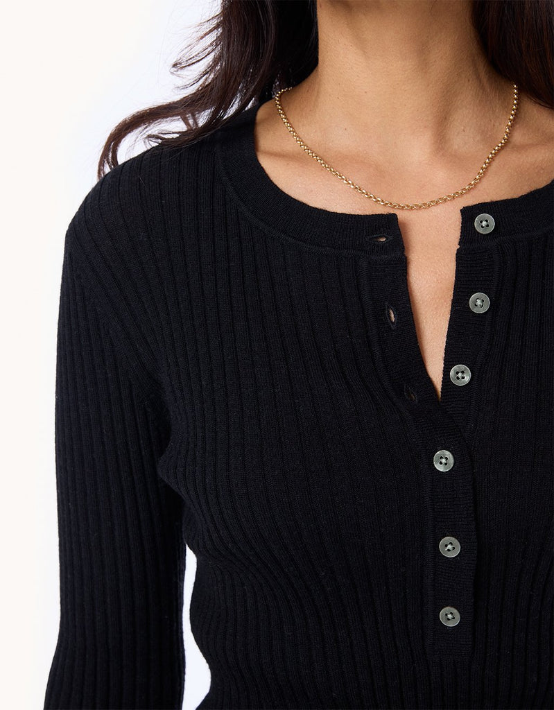A luxe staple, this henley is knitted from soft merino wool with a ribbed finish for a classic look. The semi sheer finish lends itself to layering, while the mother-of-pearl buttons elevate the look.