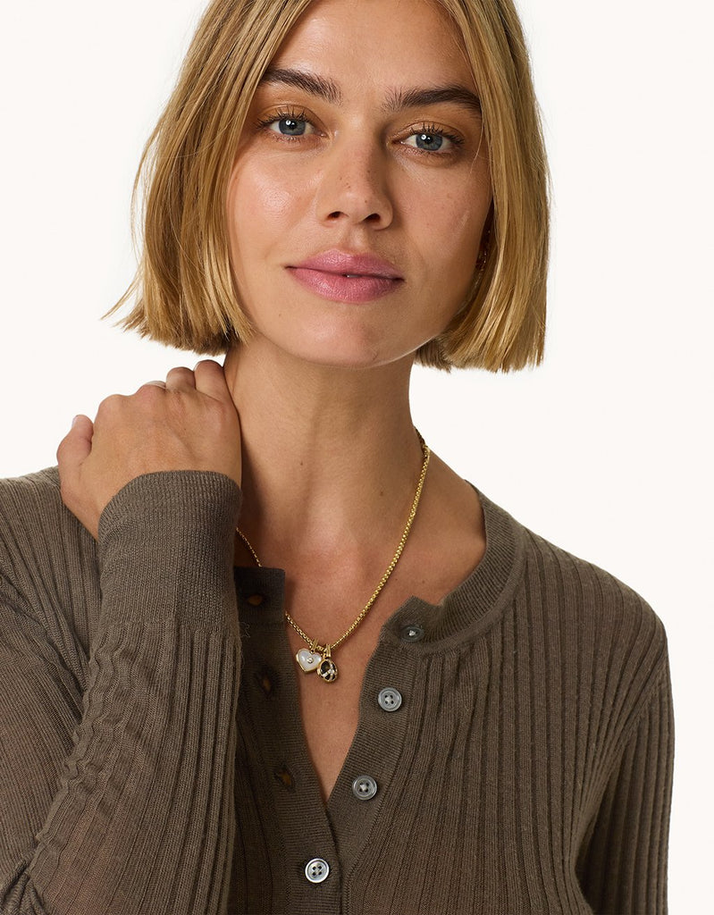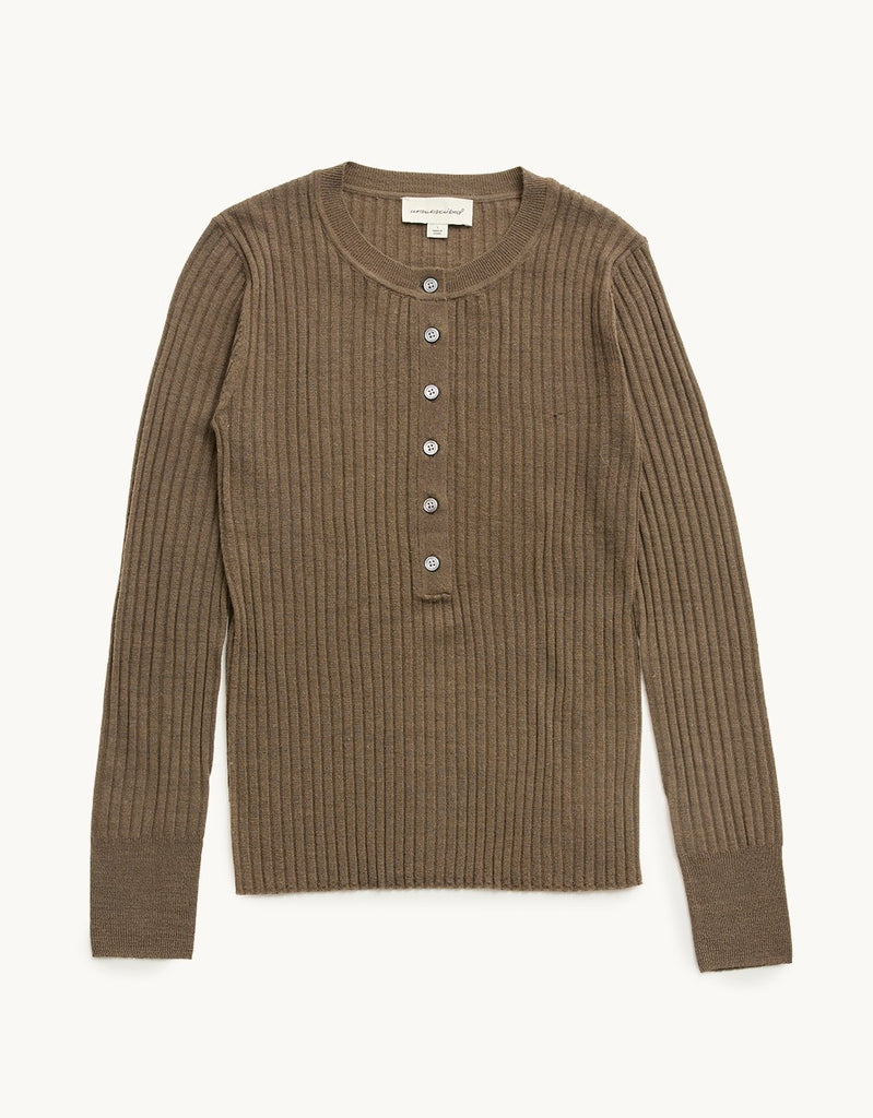 A luxe staple, this henley is knitted from soft merino wool with a ribbed finish for a classic look. The semi sheer finish lends itself to layering, while the mother-of-pearl buttons elevate the look.