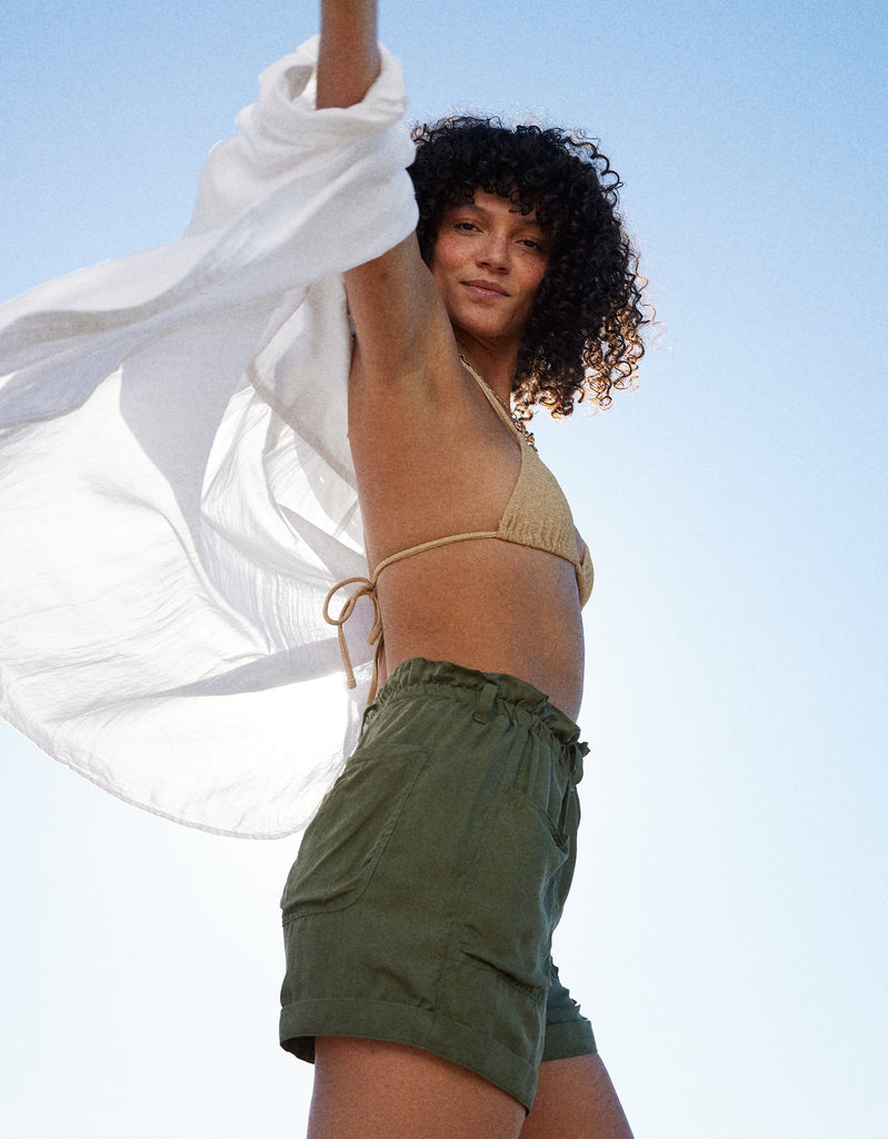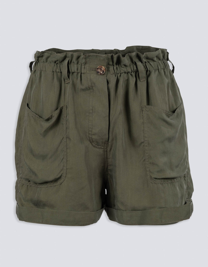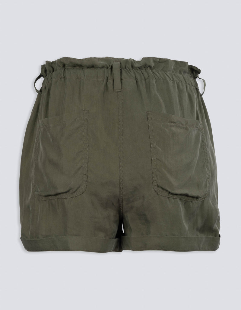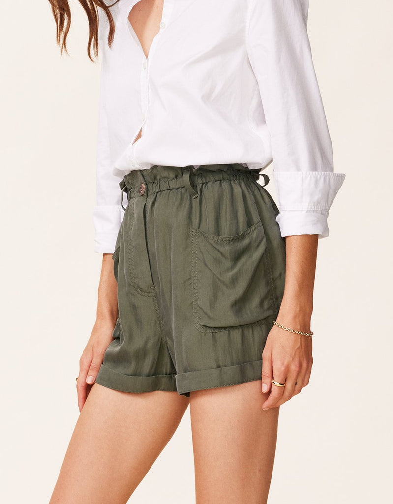 an all-purpose short that's up for everything. inspired by utility, it's detailed with patch pockets and bar tacks often found in classic denim. we crafted it in soft silk with a paperback waist for an elegant feel.