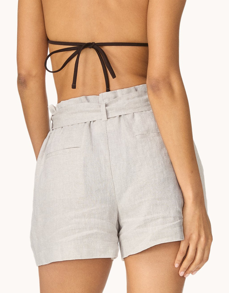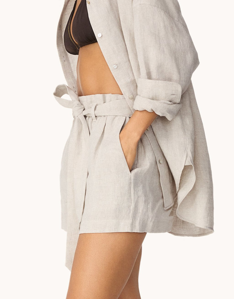your warm weather go-to. these shorts are designed from shimmering, italian linen with a paperbag waist for a touch of volume.