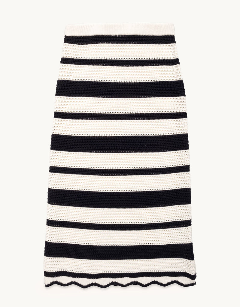a beachside classic, this sweater skirt is crafted from cotton with crochet-inspired stitching for a textured finish. the scalloped hem lends a vintage touch.
