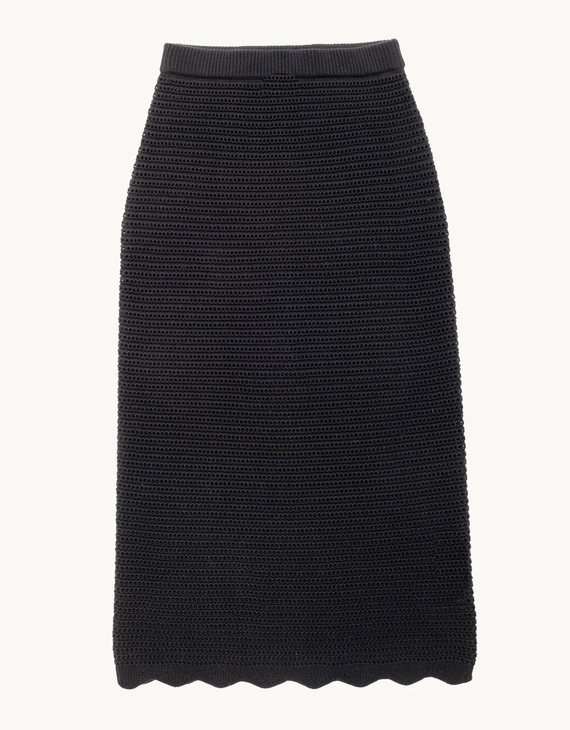 a beachside classic, this sweater skirt is crafted from cotton with crochet-inspired stitching for a textured finish. the scalloped hem lends a vintage touch.