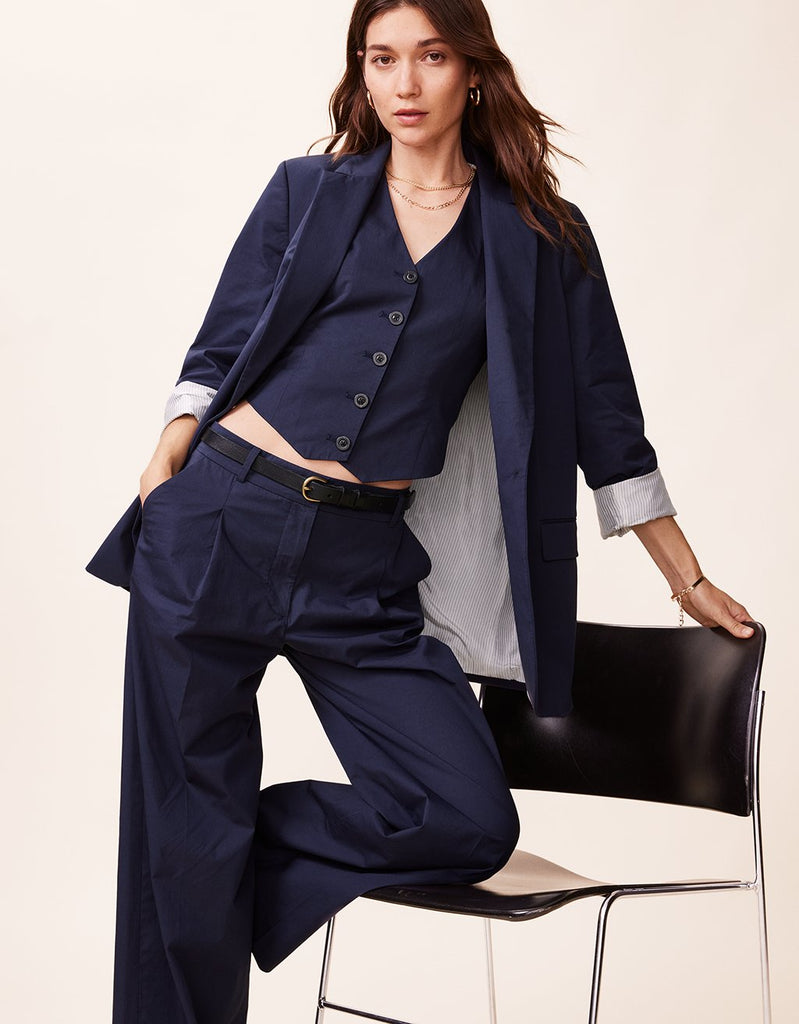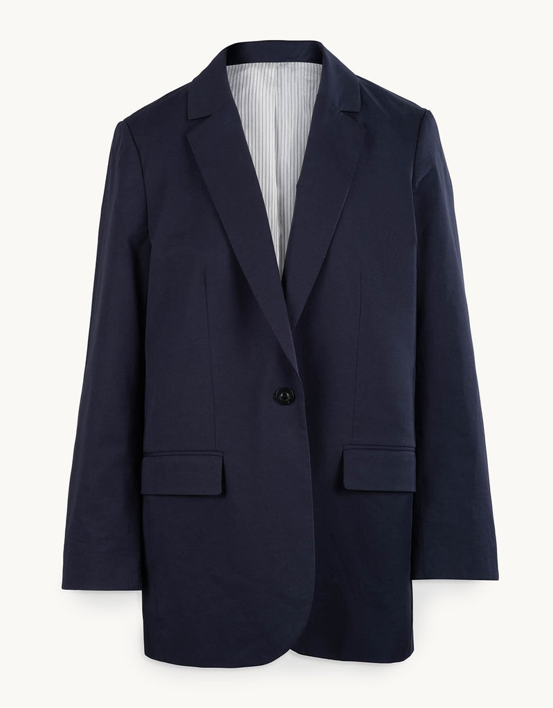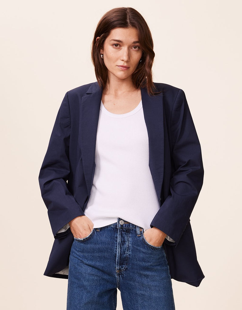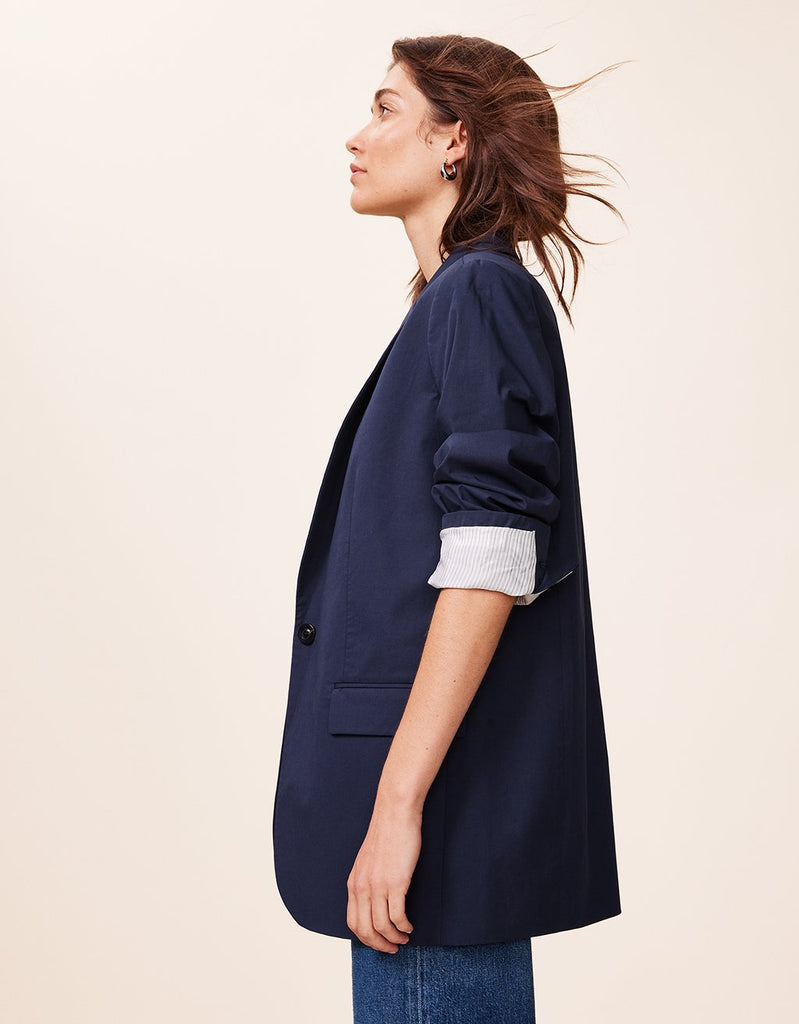 our poplin blazer is a modern take on classic tailoring. designed with clean lines and a relaxed fit, we made it from stretch poplin with a striped lining. the lightly padded shoulders make a gentle statement.