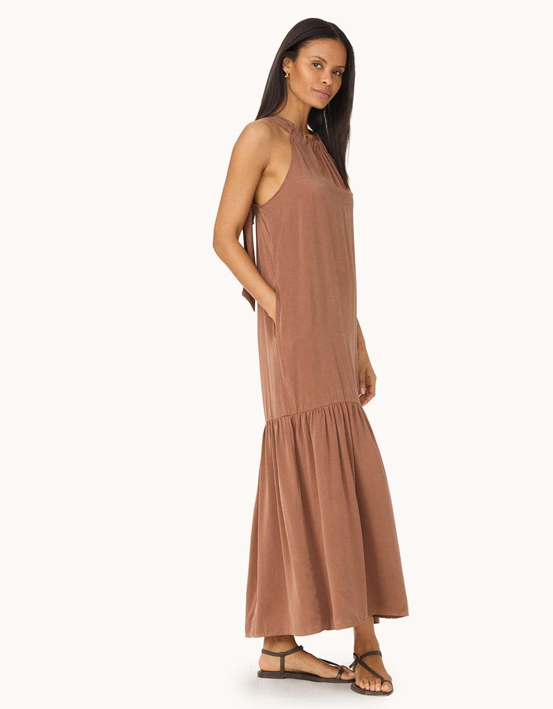 a relaxed take on elegance. crafted from luxuriously soft silk charmeuse, this maxi is easy to wear, and even easier to style. we designed it with adjustable self ties with bows in the back.