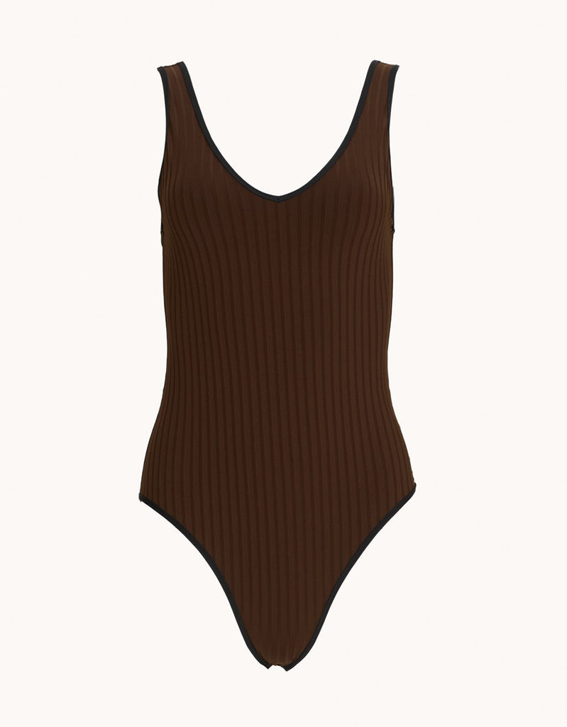 A classic swimsuit for beachy days and poolside evenings. We designed it from ribbed recycled nylon with a plunging v-neckline on both sides.