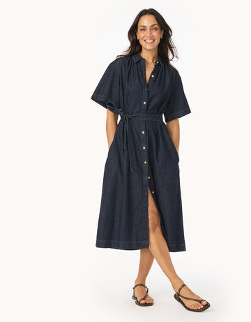 A denim dress like you've never seen before. We designed it from soft, lightweight denim with voluminous tunnel sleeves, a removable waist belt and an A-line skirt that has pockets on both sides. It's detailed with gold-tone buttons for an elegant finish.